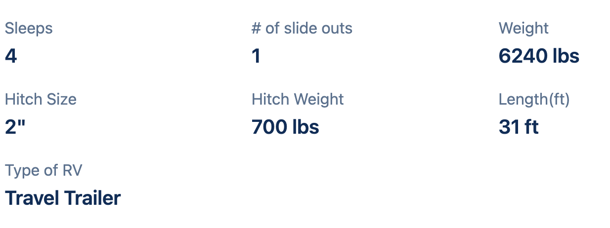 This spacious travel trailer is perfect for a couple. It has everything you need for a comfortable and enjoyable camping trip, including a well-equipped kitchen, a spacious living area, and huge rear bathroom. The air conditioning and heat will keep you comfortable no matter what the weather, and the patio awning is perfect for relaxing outdoors. The trailer has a 40" TV, reclining theater seating and a fireplace for those cozt nights at the campsite. The queen bed has a 4" foam matress that is like sleeping on a cloud.